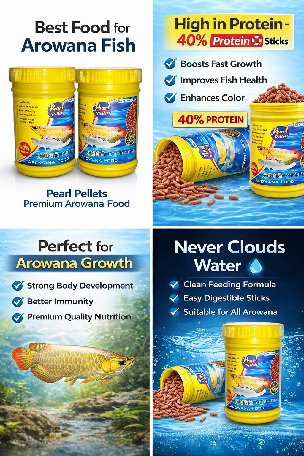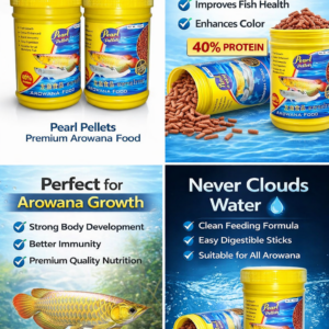Pearl Pellets Arowana Fish Food is specially formulated to provide complete and balanced nutrition for Arowana fish. Enriched with 40% high-quality protein, these premium sticks support faster growth, enhance natural color, and improve overall fish health.