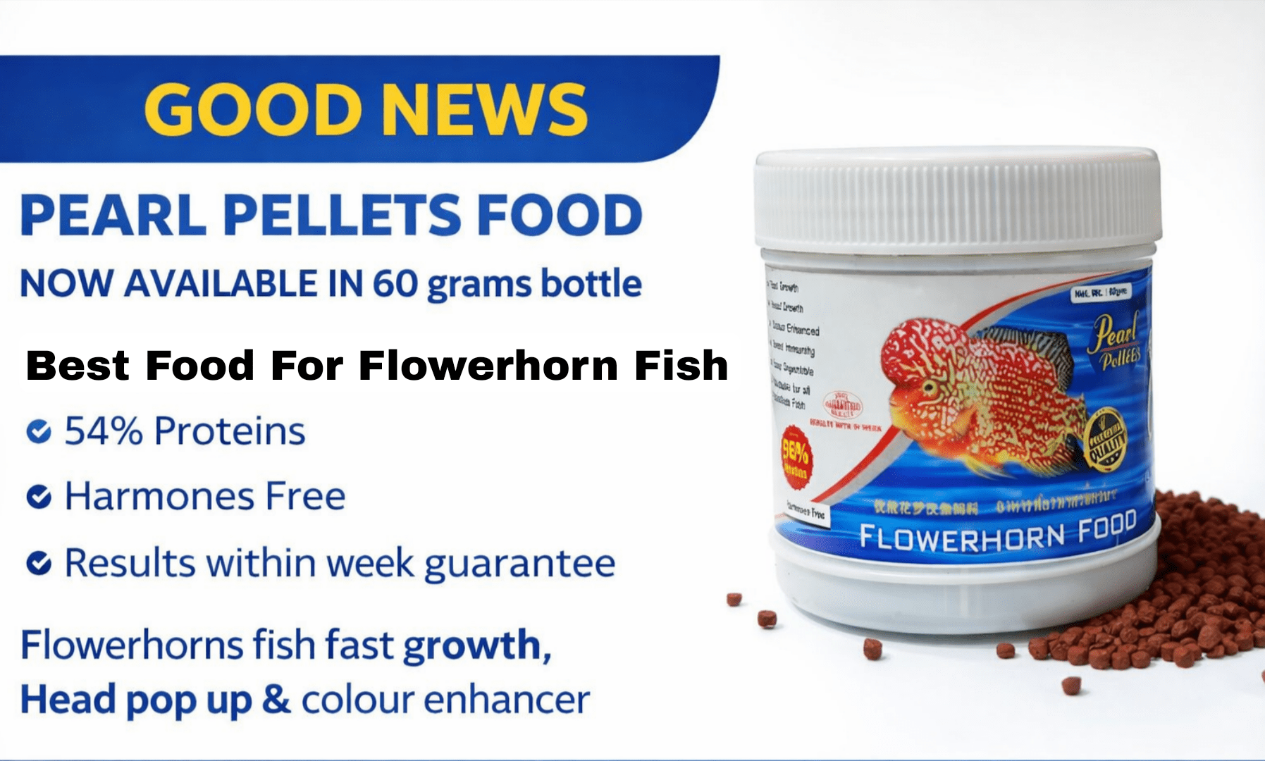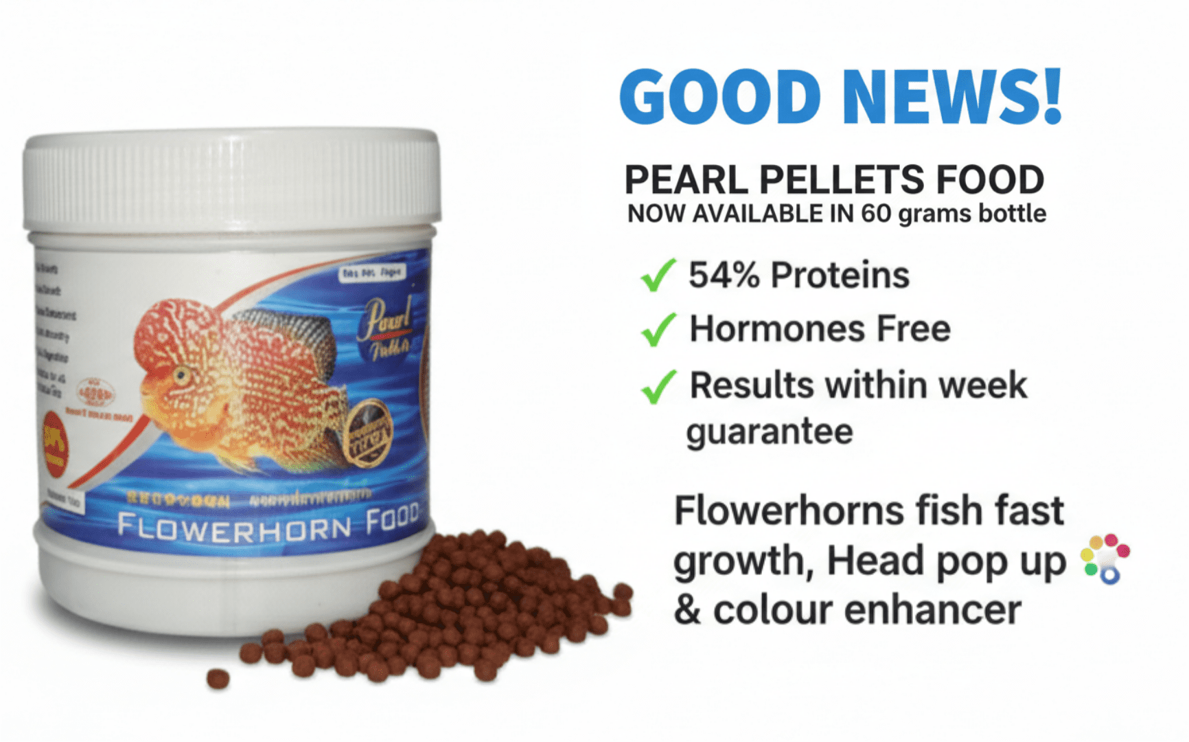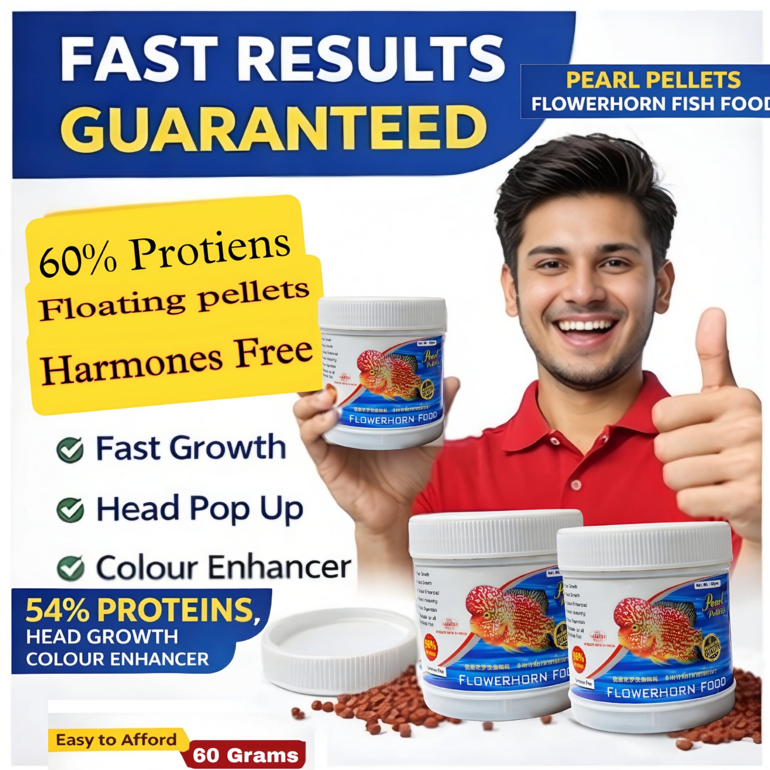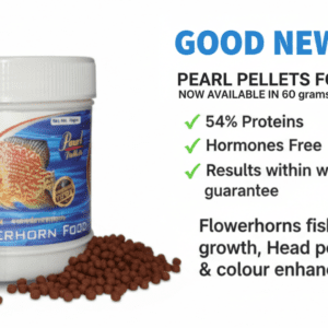 Pearl Pellets Flowerhorn Fish Food is a premium-quality floating pellet feed specially formulated for Flowerhorn and other large cichlid fishes. Enriched with high protein and essential nutrients, it supports fast growth, enhances natural colour, and promotes healthy head (kok) development.