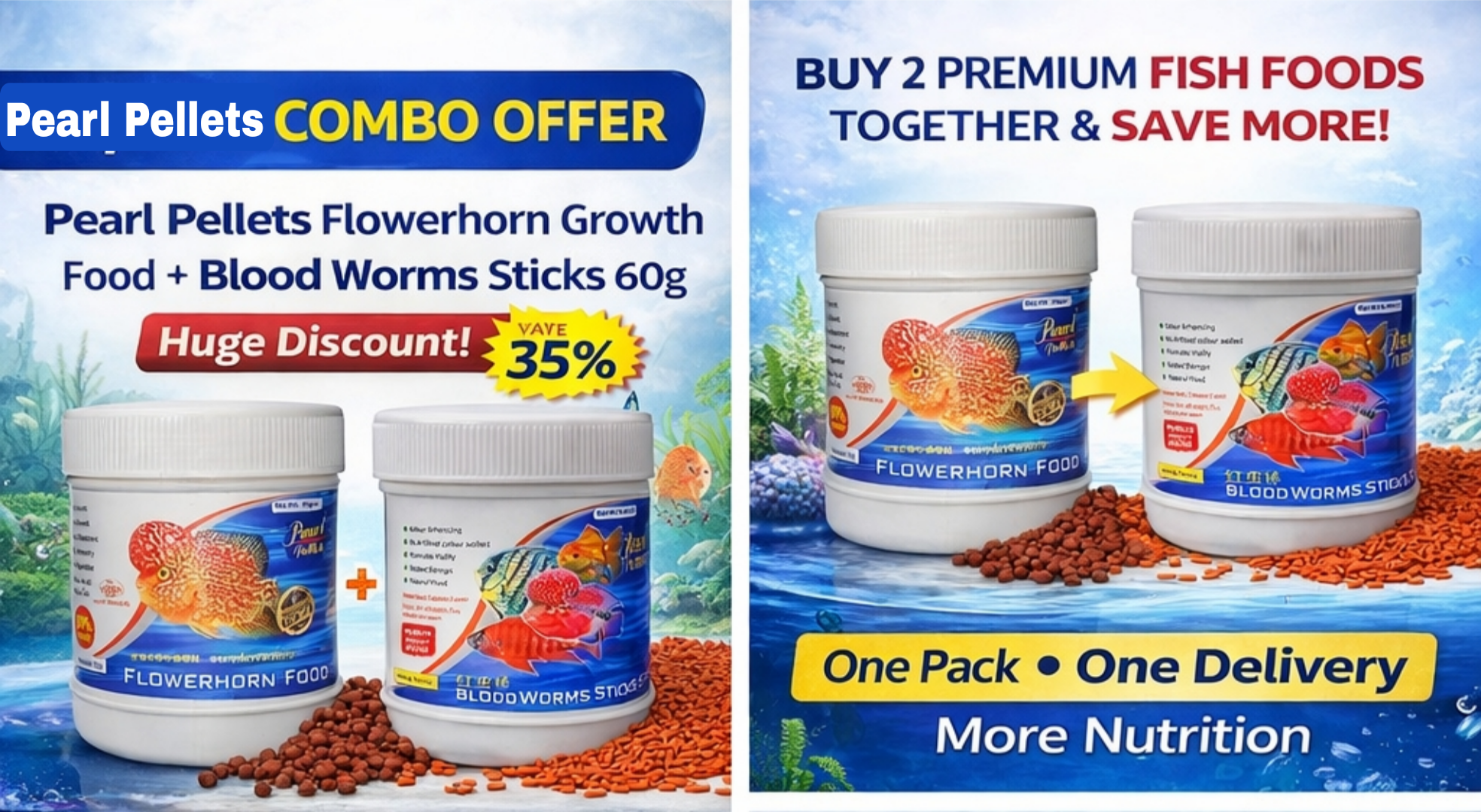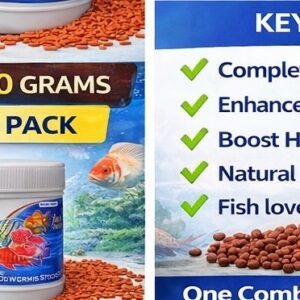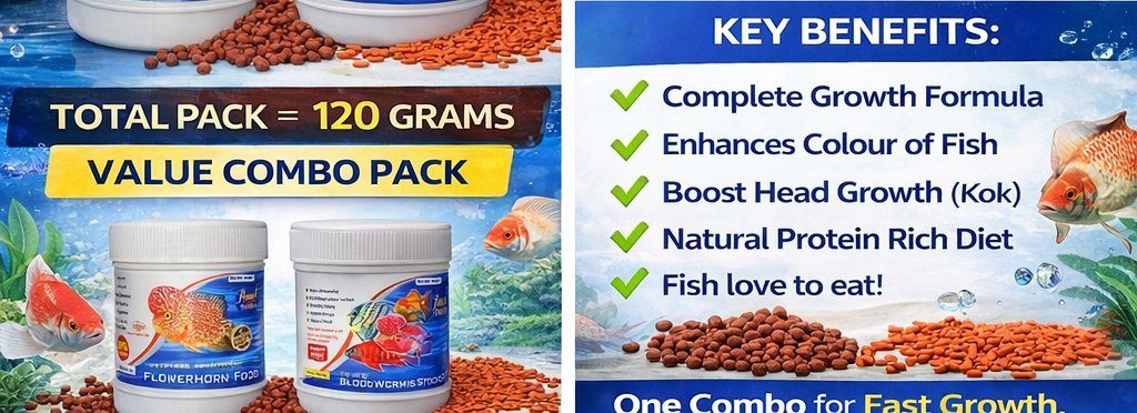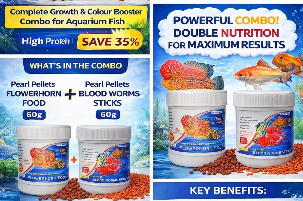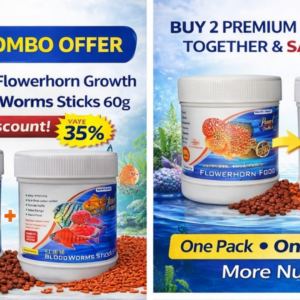 This combo includes Flowerhorn Growth Pellets and Blood Worms Sticks, providing a rich protein diet that supports daily nutrition needs of Flowerhorns and other ornamental fishes.