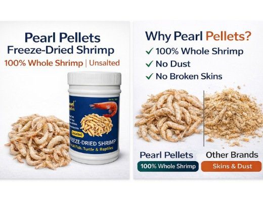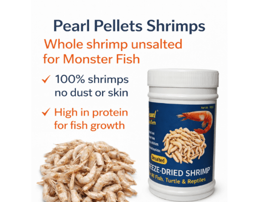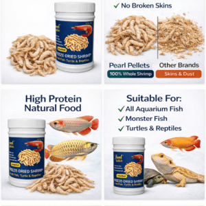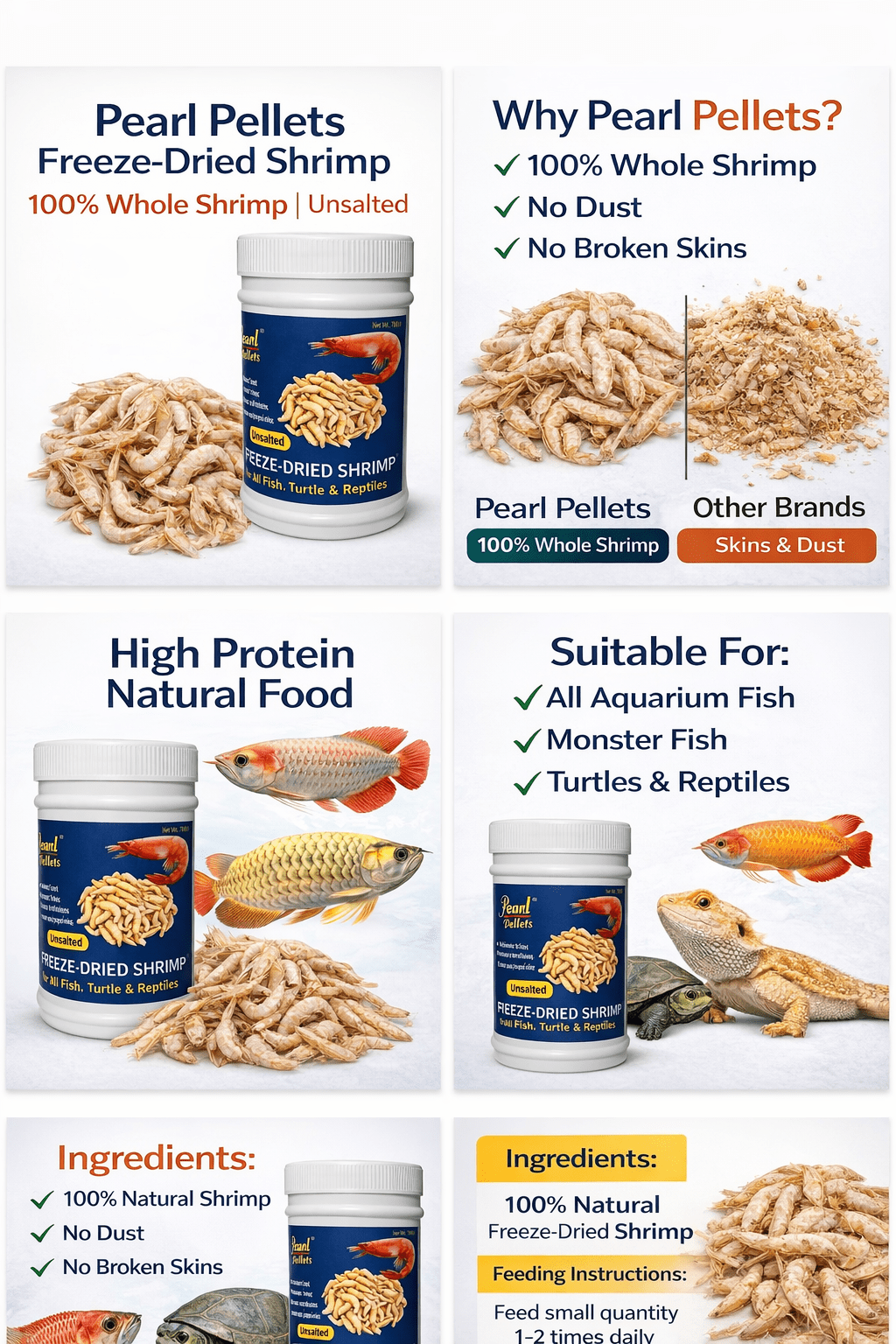 Pearl Pellets Freeze-Dried Shrimp is a premium quality natural feed made from 100% whole shrimp. Carefully freeze-dried to preserve essential nutrients, this protein-rich food supports healthy growth, vibrant colour development, and improved immunity in aquarium fish, turtles, and reptiles.