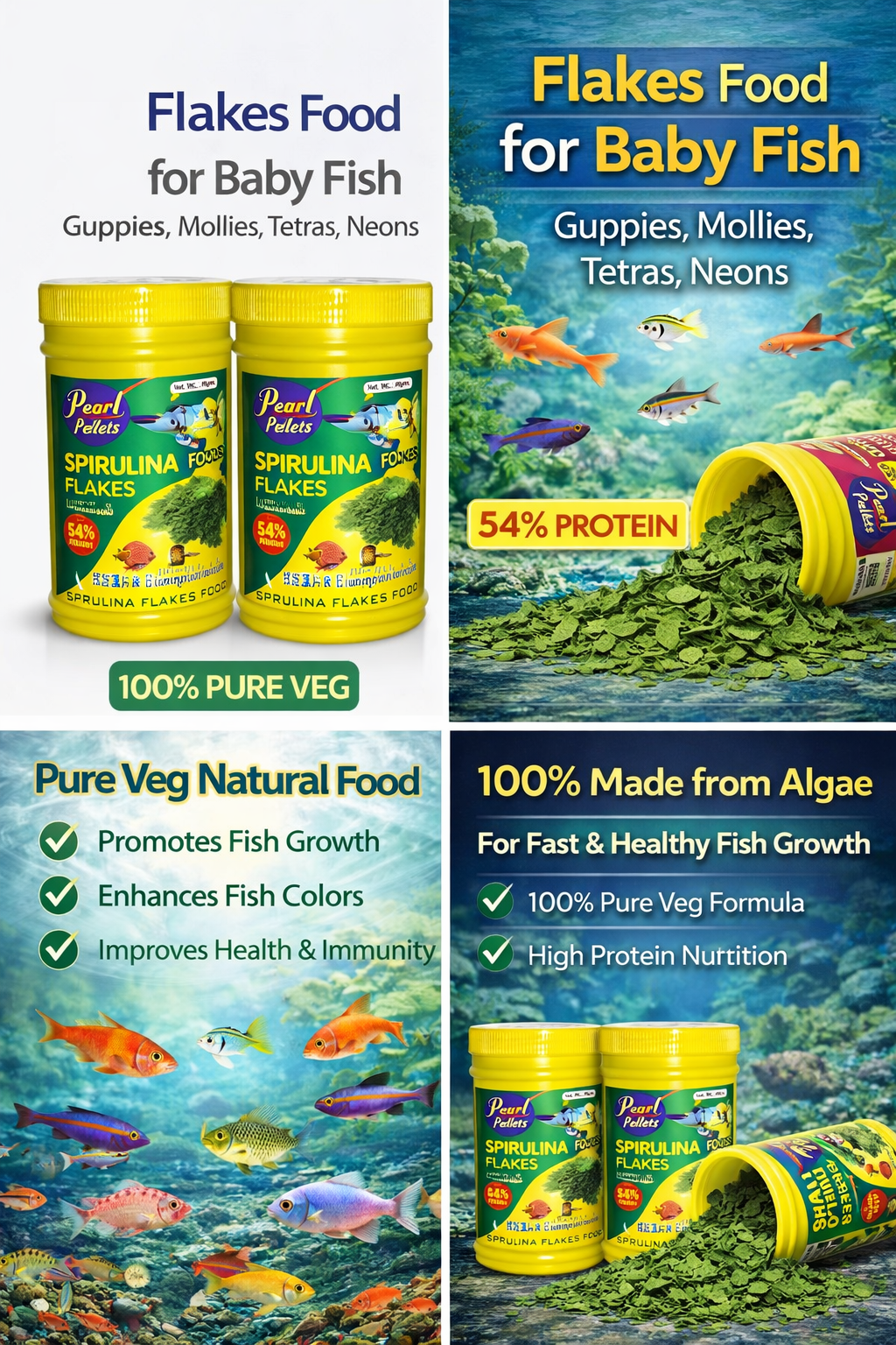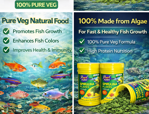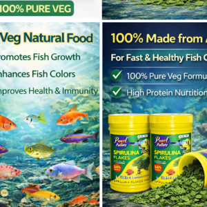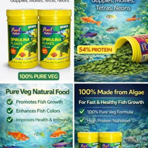 Pearl Pellets Spirulina Flakes are a 100% pure vegetarian fish food made from natural algae (spirulina), specially designed for baby and small aquarium fish like Guppies, Mollies, Tetras, and Neon fish.