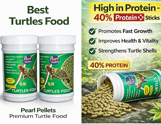 Pearl Pellets Turtle Food is a premium, nutritionally balanced diet specially designed for all types of turtles. With 40% high-quality protein, it supports faster growth, improves overall health, and strengthens shell development.